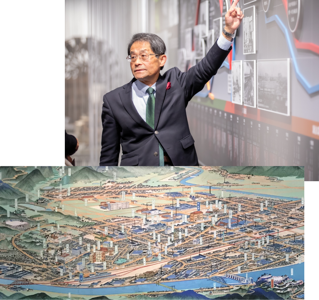 「製糸工場で働く工女さんの多くは住み込みで働いていました。当然、3食付きです。そして、その食事に欠かせないのが味噌汁を始めとする味噌料理でした。最盛期には岡谷市内に34,500人いた工女さんの食事を支えるために、岡谷・諏訪エリアでは味噌づくりが盛んになりました。大きな工場の場合は、自社内に味噌蔵を持っていたところもあるくらいです。製糸業は、やがて、軍需産業を経て、精密機器製造へと移り変わっていきますが、味噌づくりは変わらず残ったのです。」