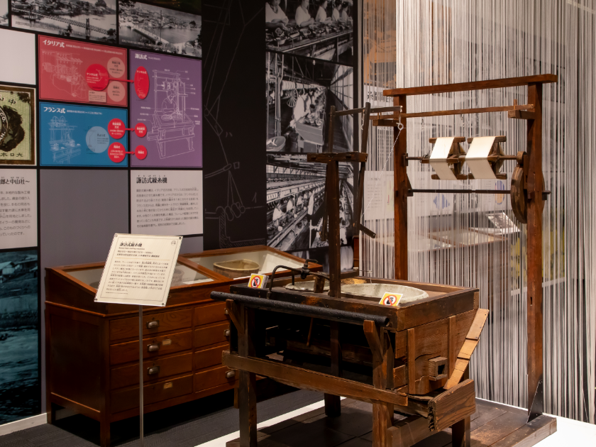 「そして、才能のある技術者の代表と言えるのが、諏訪式繰糸機(すわしきそうしき)を開発した武居代次郎さんでしょう。岡谷出身の糸商で『キカイ道楽』と言われるほどの機械好きだったそうです。明治初期、日本の製糸工場で主流だったのは、明治政府が富岡製糸場に導入したフランス式繰糸機でした。これに、前橋藩が導入したイタリア式繰糸機の良い技術を取り入れつつ、日本人女性が作業しやすいコンパクトなサイズにしたのが諏訪式繰糸機です。金属製ではなく木製なので、低コストで機械を作ることができました。これが岡谷諏訪エリアのみならず、日本全国に広がっていったのです。」